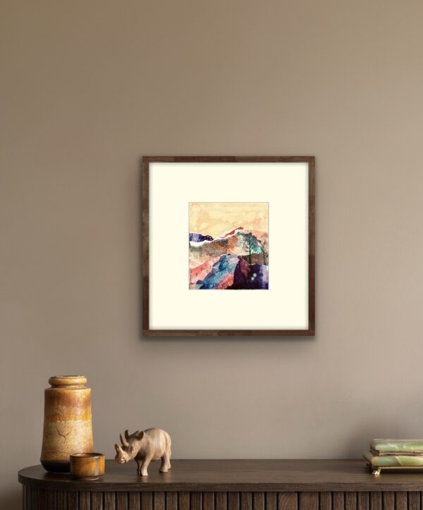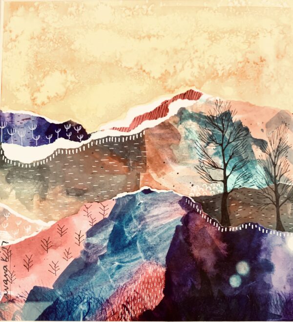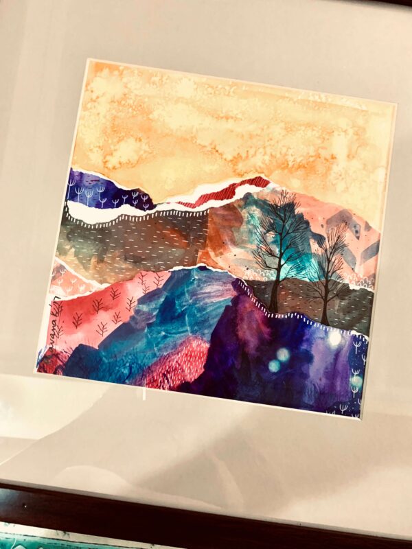 This piece is constructed from delicately hand-painted papers, built up through layers of watercolour with vibrant colours and expressive mark-making. The papers are torn and thoughtfully layered, creating depth, texture, and movement within the composition. Detailed pen work is added as a final element, tying the layers together and completing the artwork.