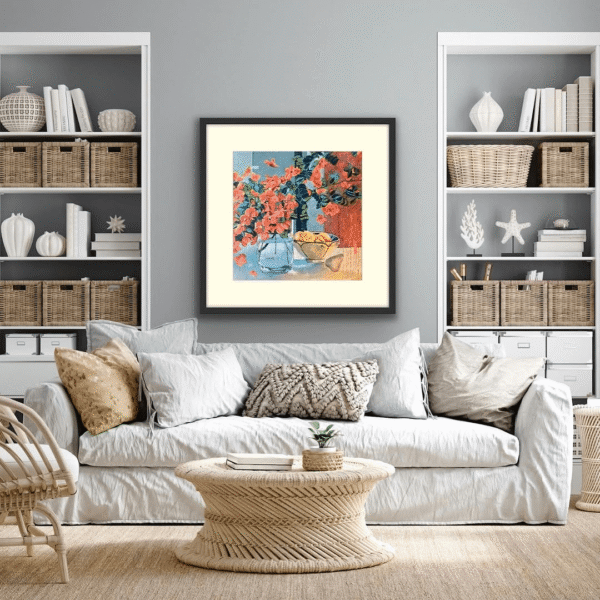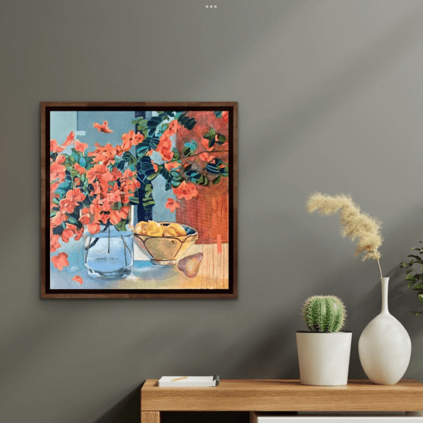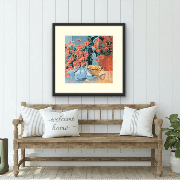 Orange Martini is a playful and colourful art work, all about the balance between abstraction and realism—there’s something magical about the way these elements converse with one another. It’s like a story is unfolding in layers—abstract and literal at once. The transparent pear, with its delicate quality against the textured background, gives a beautiful sense of contrast.