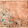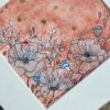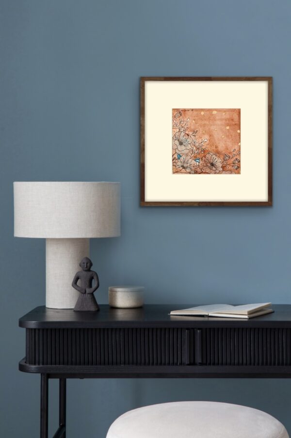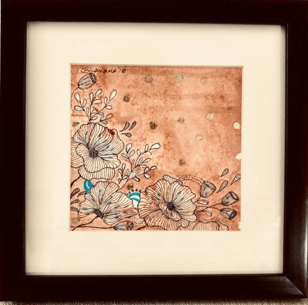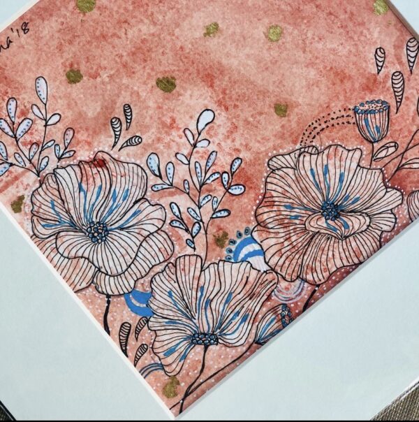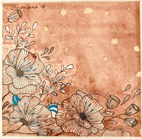 This piece explores the fluidity of watercolours, complemented by flowers delicately illustrated in pen. The background is enriched with touches of gold leaf, adding warmth and luminosity. The overall composition remains simple, refined, and elegant.