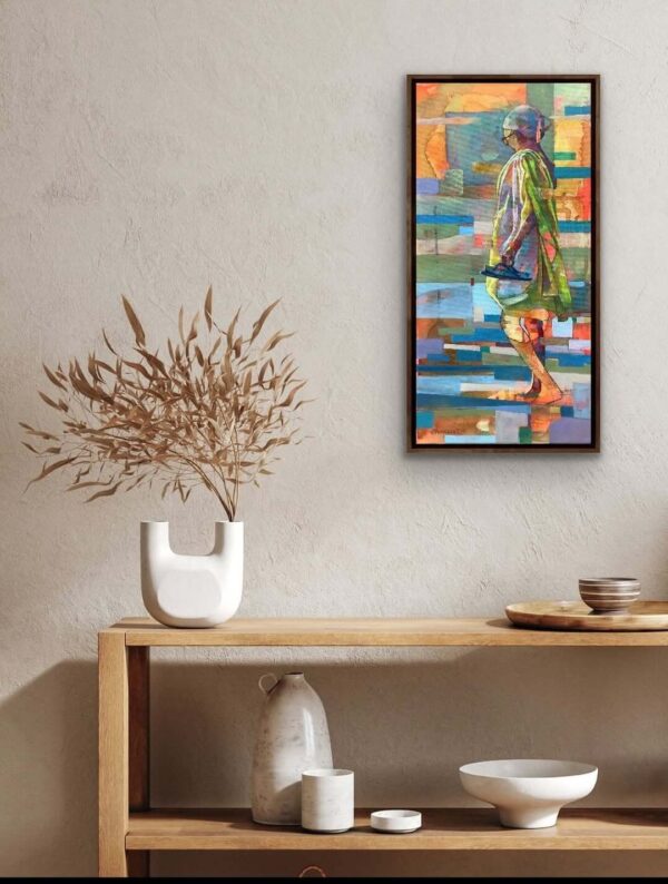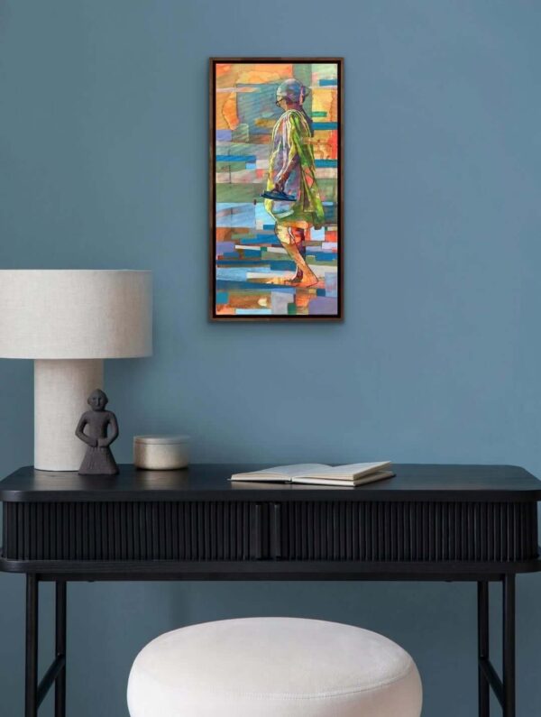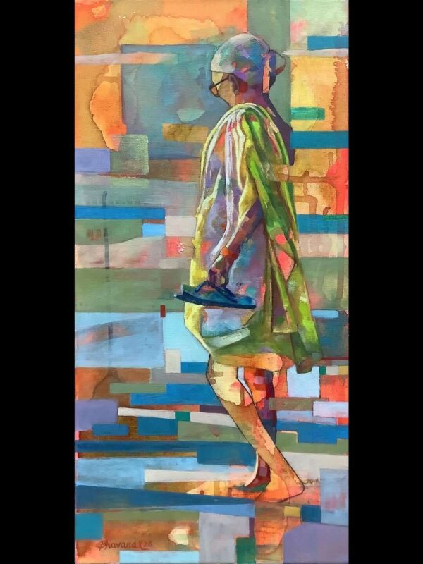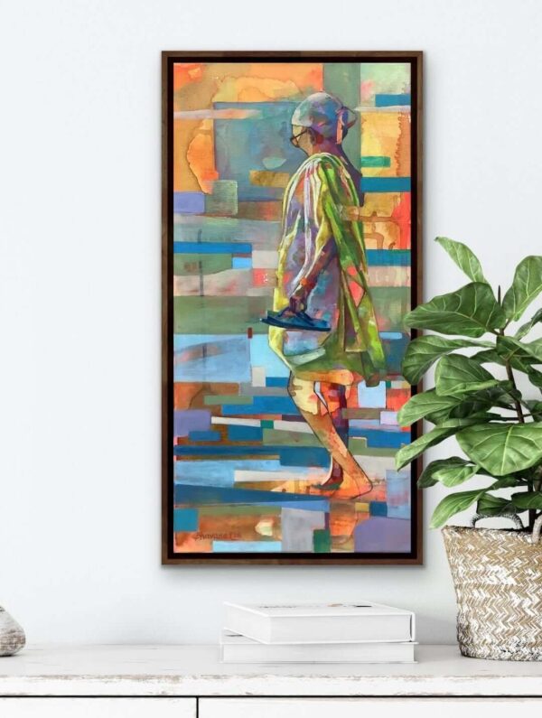 This painting portrays a woman in her later years walking alone along a quiet beach — a place where time seems both infinite and fleeting. As she moves across the shoreline, she’s lost in thought, reflecting on her life. Her memories, much like the waves beside her, ebb and flow.